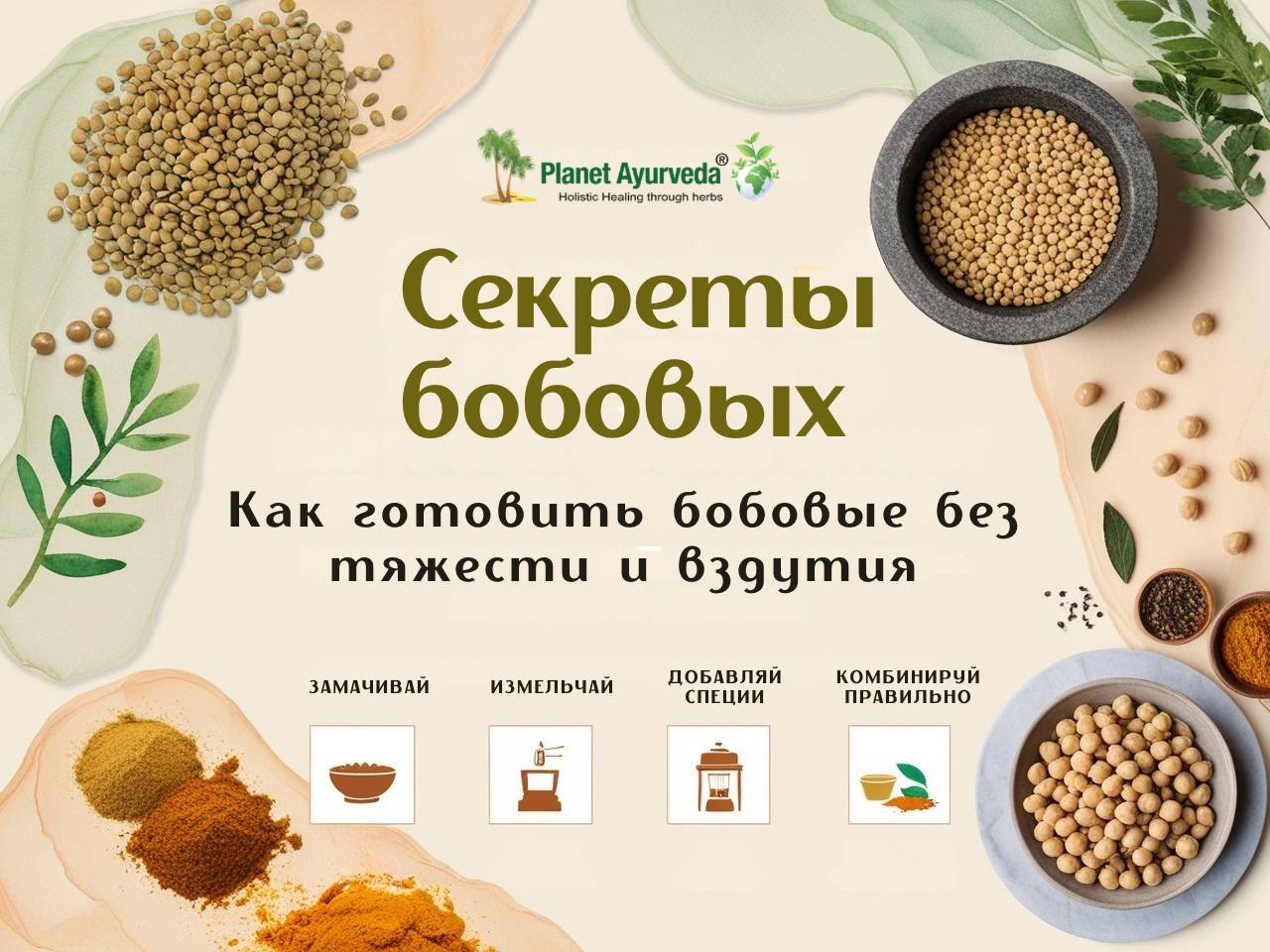 Маш (зеленый мунг) — исключение среди бобовых. Его называют «золотыми бобами» за мягкое действие и способность уравновешивать все три доши (вата, питта и капха). Он считается наиболее легкоусвояемым бобовым в Аюрведе.